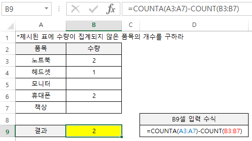 조금 복잡하고 굳이 사용할 필요가 없는 방법일 수 있지만 좀 더 응용해서 생각해보면 '수량이 집계되지 않은 품목의 개수'는 곧 '전체 품목의 개수 - 수량이 집계된 품목의 개수'로 식을 만들 수도 있습니다.