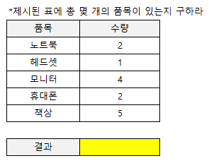 문제가 '수량이 집계된 품목의 개수를 구하라' 였다면, COUNT 함수나 COUNTA 함수를 이용하여 구할 수 있다는 것을 확인할 수 있습니다.