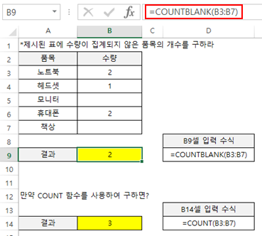 B9셀에 COUNTBLANK 함수를 사용하여, 수량이 공란으로 되어있는 셀의 개수를 구할 수 있었습니다.