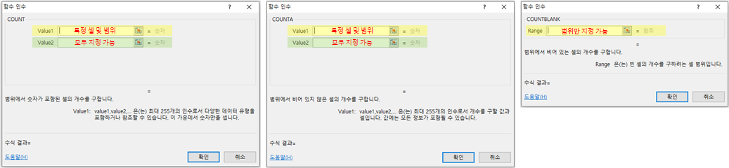 각 함수의 구조를 살펴보면 일반적으로 ①COUNT(범위), ②COUNTA(범위), ③COUNTBLANK(범위)로 수식을 작성할 수 있으며, 함수 마법사를 통해 아래와 같이 확인할 수 있습니다.
