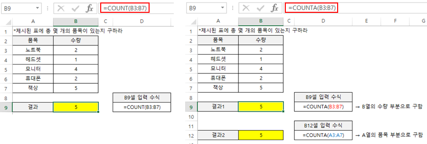 해당 예제는 두 함수를 이용해 위와 같이 풀 수 있으며, COUNT 함수는 숫자만 셀 수 있으므로 숫자가 표시된 B열의 수량을 범위로 지정해야 됩니다.