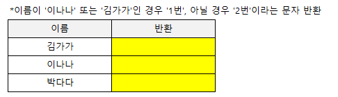 위 예제는 조건에 따라 특정 값을 반환하는 것으로 조건은 이름이 '이나나' 또는 '김가가'인 경우이며, 이때 조건이 맞는지 여부에 따라 '1번' 또는 '2번'이라는 값을 반환하게 됩니다.