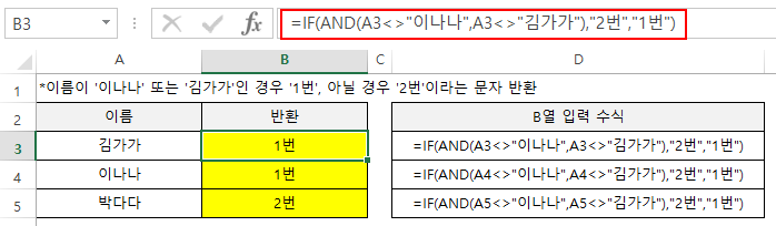 위 내용을 적용하여 수식을 정리하면, IF(AND(이름<>"이나나",이름<>"김가가"),"2번",1번")이 됩니다.