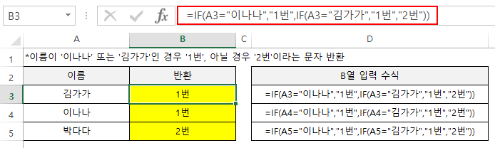 우선 ①IF 함수 중첩을 이용한 방법을 확인하면 IF(이름="이나나","1번",IF(이름="김가가","1번","2번"))과 같이 구성할 수 있습니다.