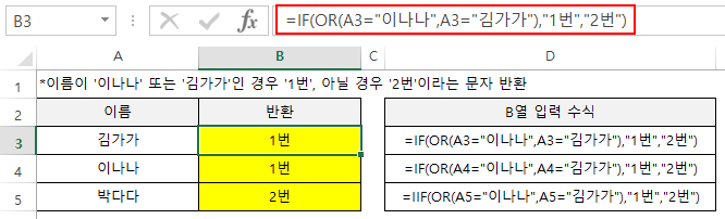 따라서 최종 수식은 IF(OR(이름="이나나",이름="김가가"),"1번","2번")이 됩니다.